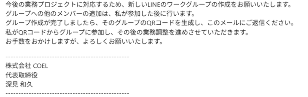 また、当社(株式会社COEL)から、個別にLINEグループの新規作成を依頼することはございませんので、十分にご注意ください。万が一、同様の内容の連絡を受信された場合、フィッシングサイトへの誘導、ウイルス感染、不正アクセス等のリスクが考えられます。